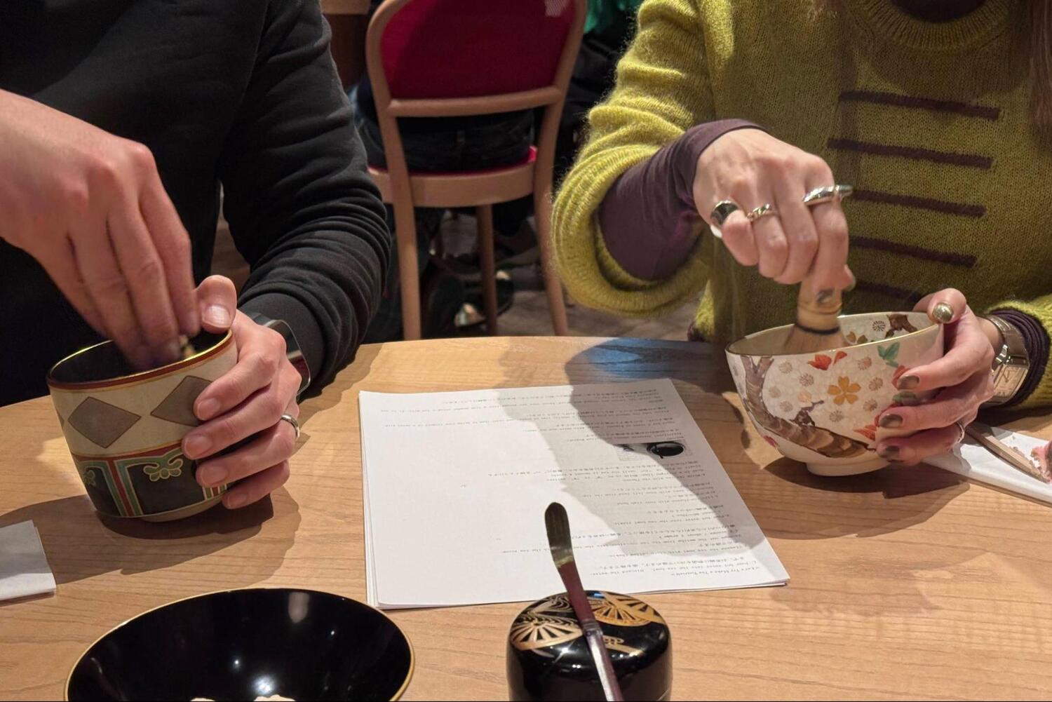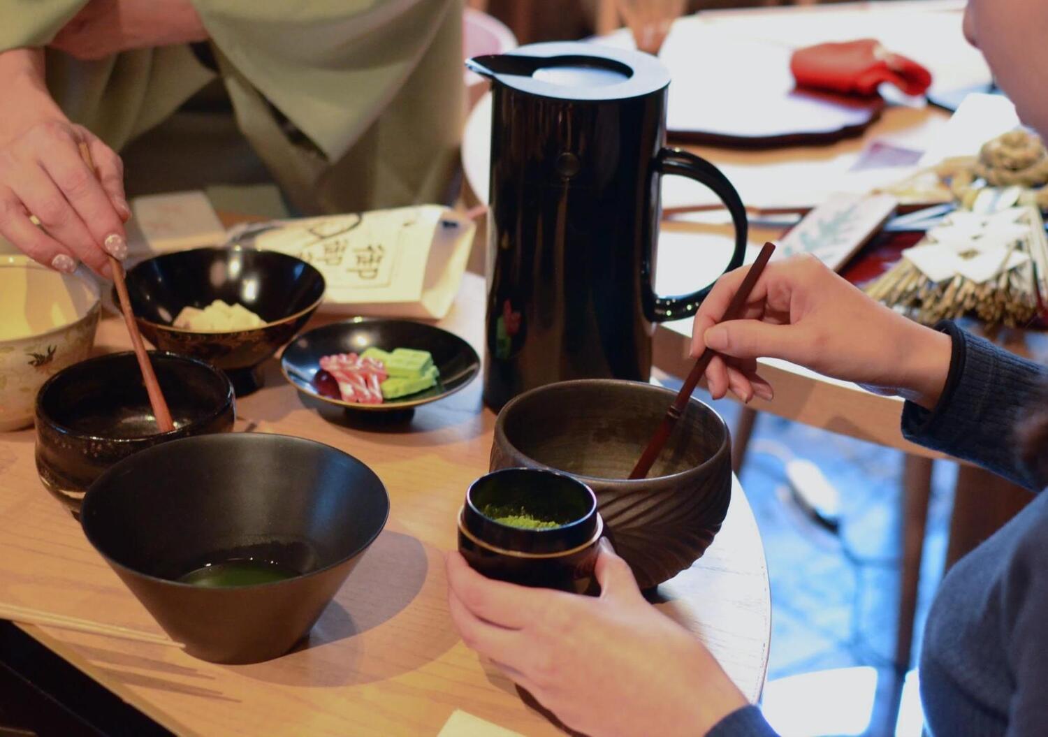 慣れない動きに戸惑うゲストには、先生がそっと手を添えてサポートする場面も。先生の温かな手解きによって、最後には全員が満足のいく自分だけの一杯を点てることができました。