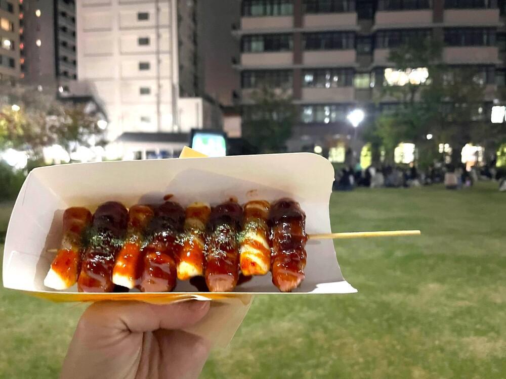 映画を観ながら芝生の上で食べる「ソトックソトック」がおいしい!ビールが飲みたくなるスパイシーな味です。