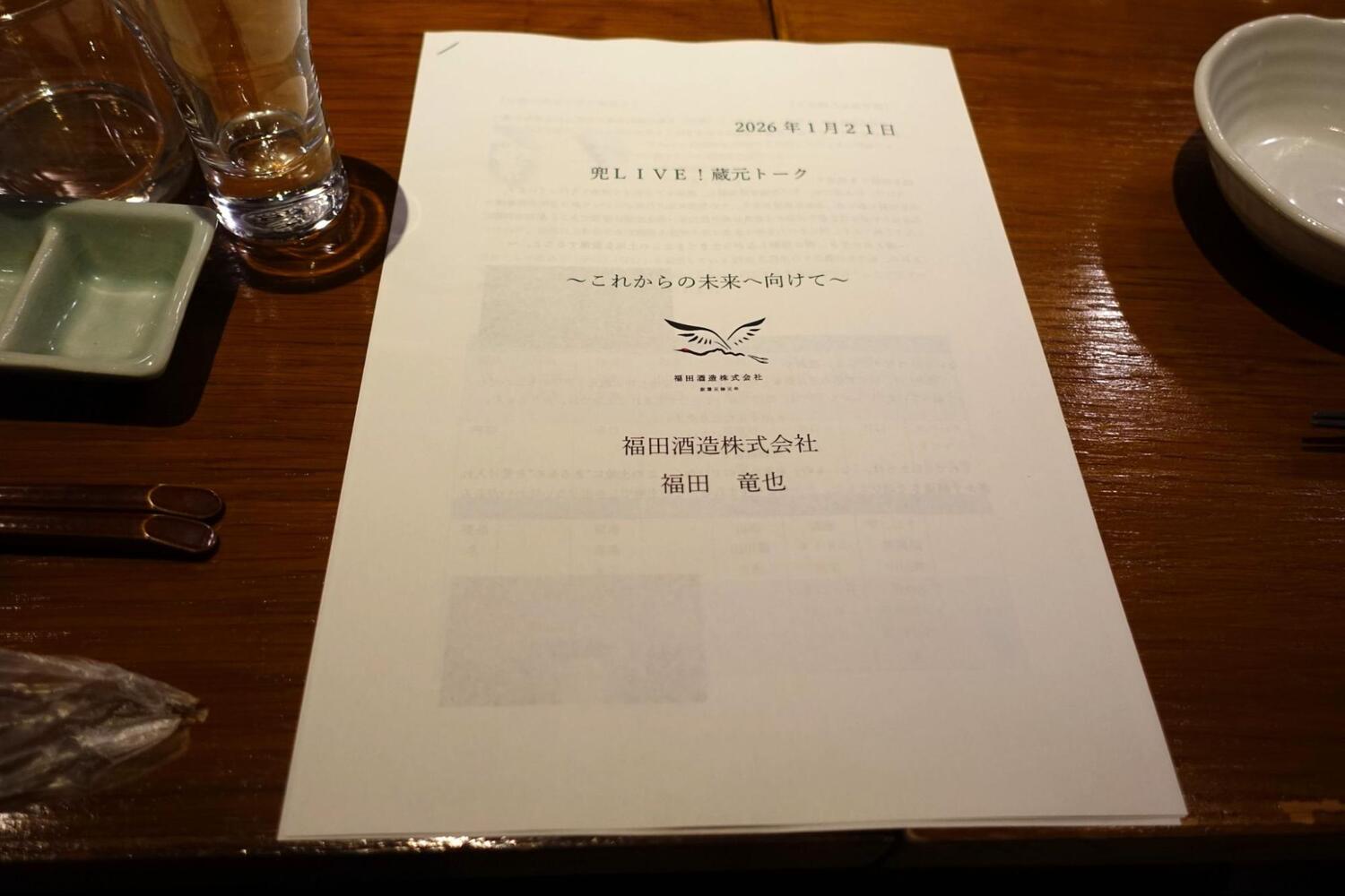 各席に用意されているのは、福田酒造のこだわりやこれからについてまとめていただいた資料です。内容については、後ほど福田さんからお話をいただきました。