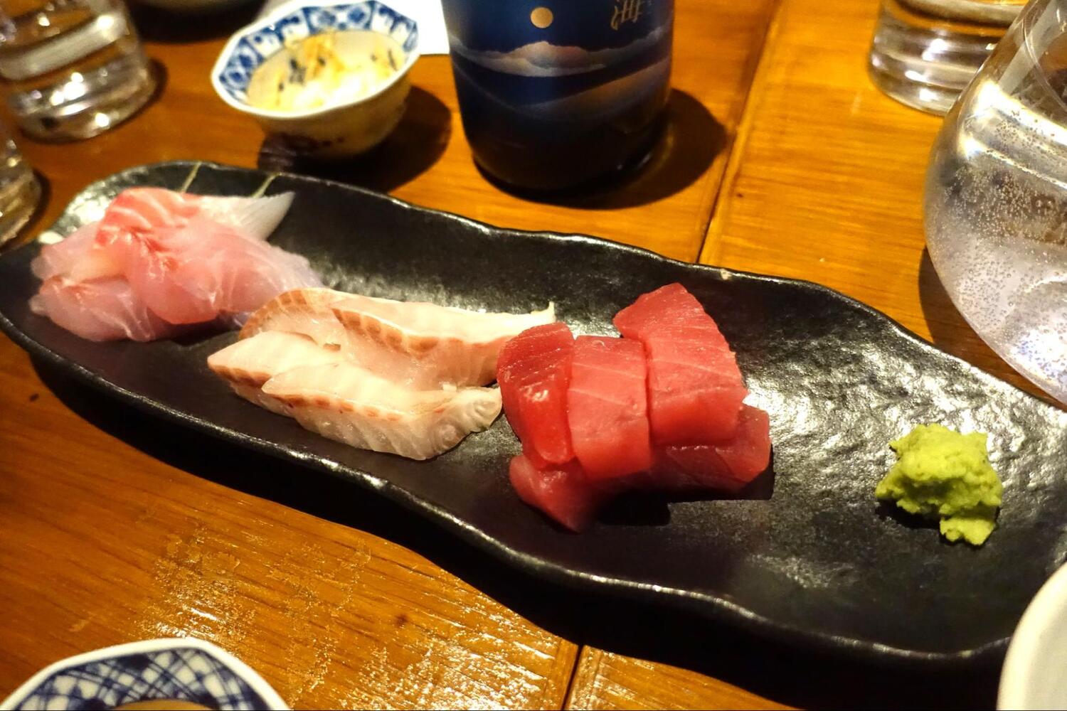 刺身の盛り合わせは、フラッグシップの『福海 山田錦 無農薬』と一緒にいただきました。厚切りで旨みがよくわかる刺身と、すっきりとした味わいにほんのり甘味のあるお酒がよく合います。