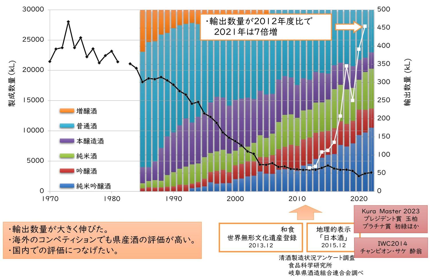 ・輸出は非常に増えて来ており、下のグラフの白い線が直近の輸出データになりますが、2021年は2012年比で7倍増となっています。直近だと、もうちょっと増えてるのではないでしょうか。各蔵元さんも大変頑張っており、少し前では古酒で「酔翁」というお酒がIWCのチャンピオン・サケに輝いたり、「玉柏」がKura Master 2023でプレジデント賞を受賞するなど各社が積極的に海外コンペティションに出品され、受賞につながるような流れが出てきていることもあって、輸出量も増えて来ているという状況が見て取れるでしょう。