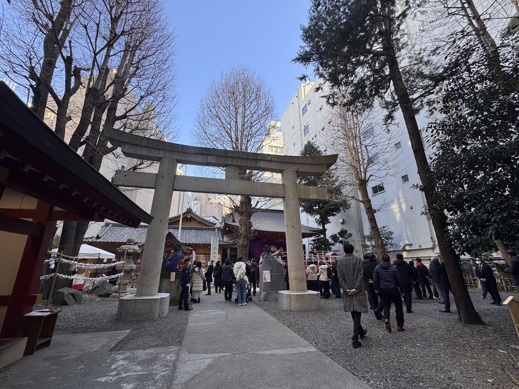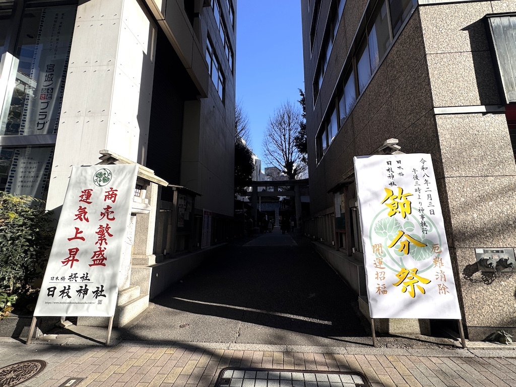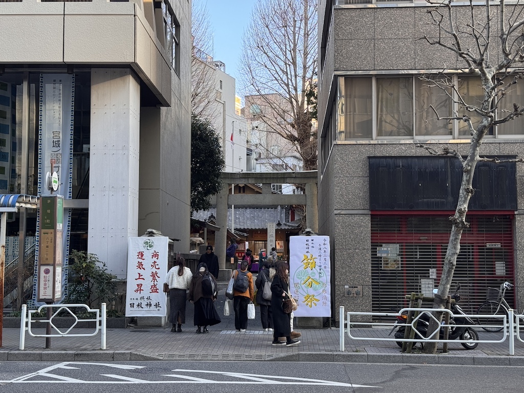 この神社は、江戸時代から続く山王祭と深い関わりを持ちながら、日本橋の地で地域の人々に親しまれてきました。境内へと向かう参道の入口には「節分祭」と書かれた案内板が立てられ、今日はいつもと違う一日であることを静かに知らせています。境内に一歩入ると、ここだけ少し空気が切り替わったように感じます。