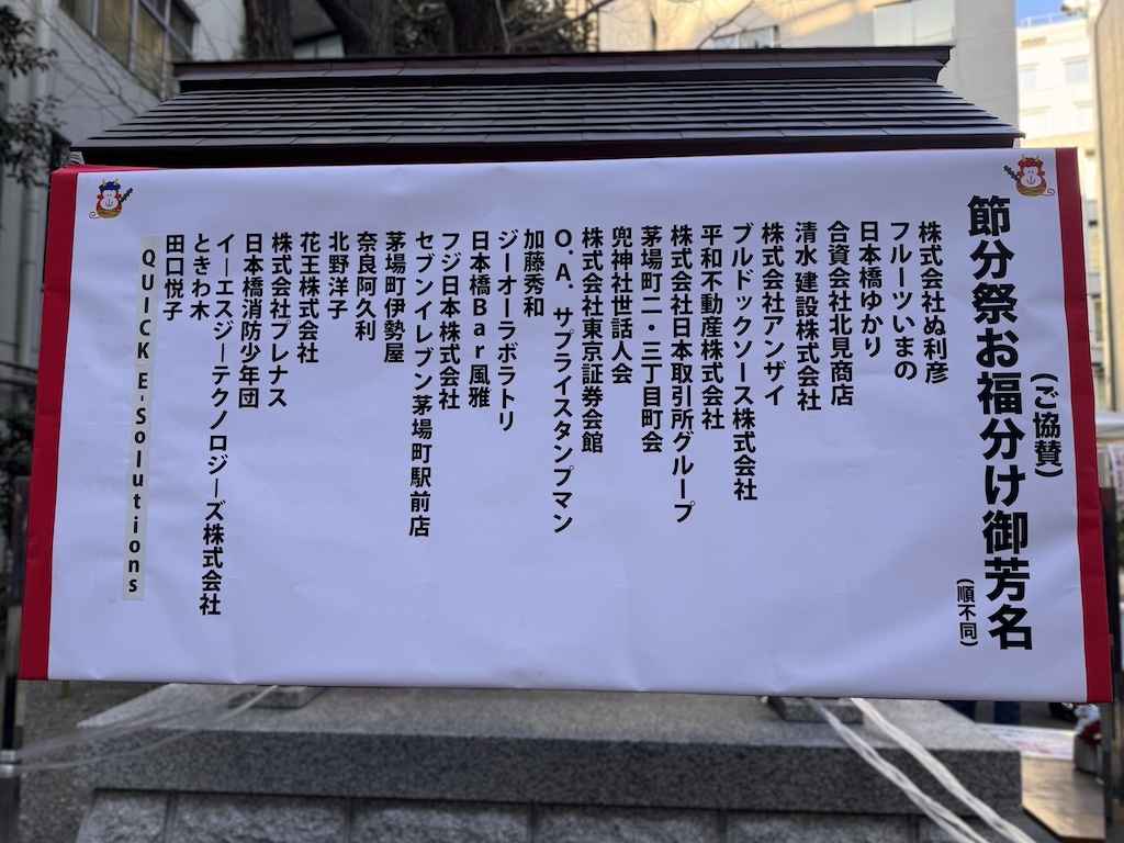 境内には、節分祭を支える企業や団体、個人の名が記された協賛一覧が掲げられています。地域全体でこの行事を支えていることが伝わってきます。
