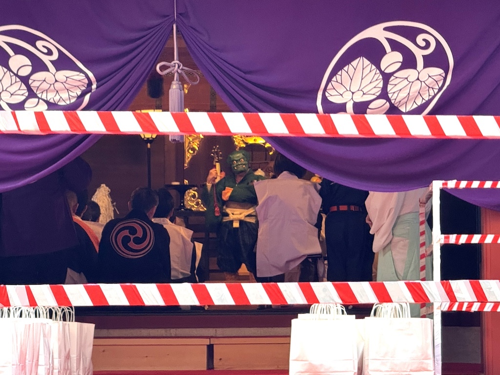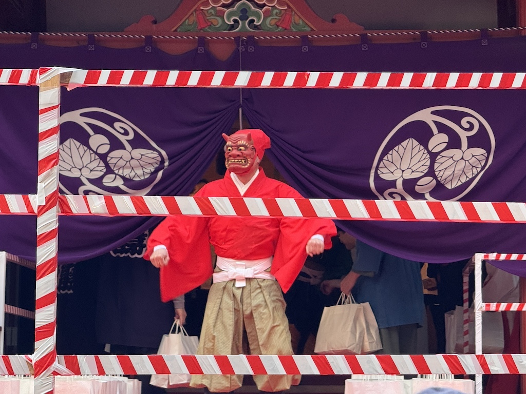 節分は、立春を前に一年の厄を払い、福を招くための行事。神殿の中では、鬼が舞う姿が遠目に見えます。やがて二拍手が響き、いよいよ豆まきの始まりです。