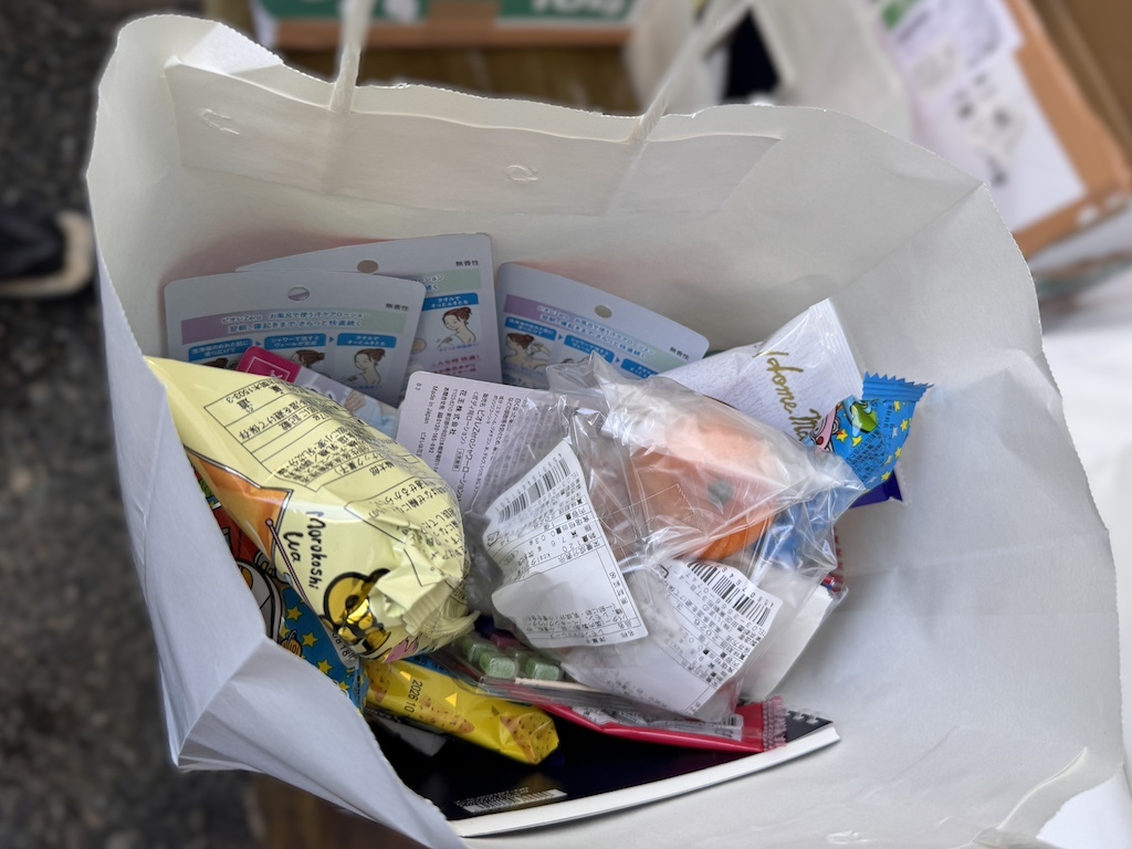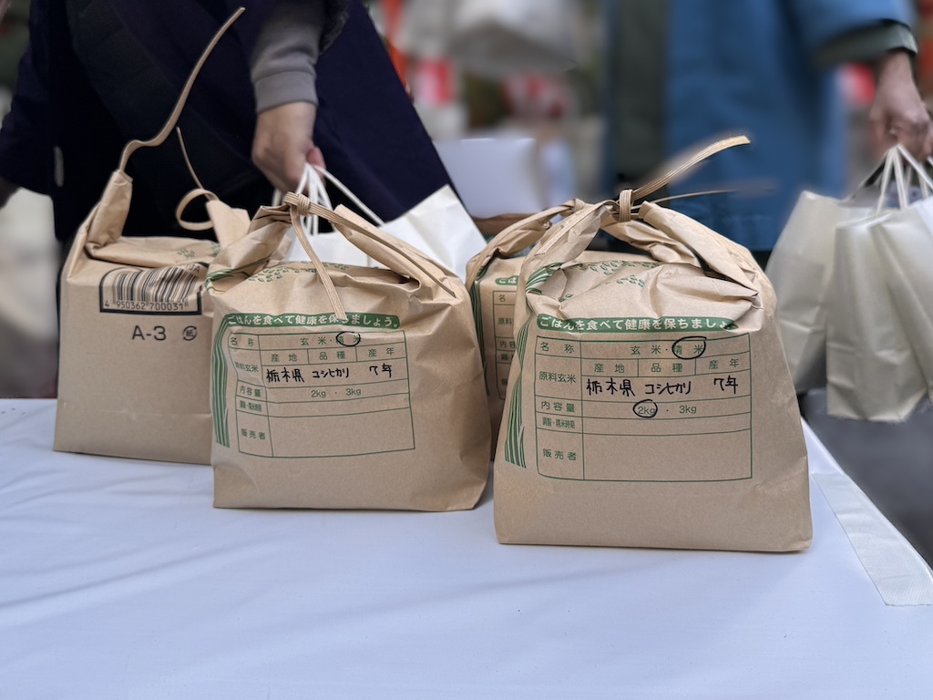 まかれた豆の袋の中には、「当たり」と赤い文字で書かれた神社札が入ったものがあり、当選者は豆まき終了後、記念品を受け取るために長い列を作ります。さまざまな商品の詰め合わせかお米のいずれかを選べるようになっており、当選者は皆さん笑顔で受け取っていました。