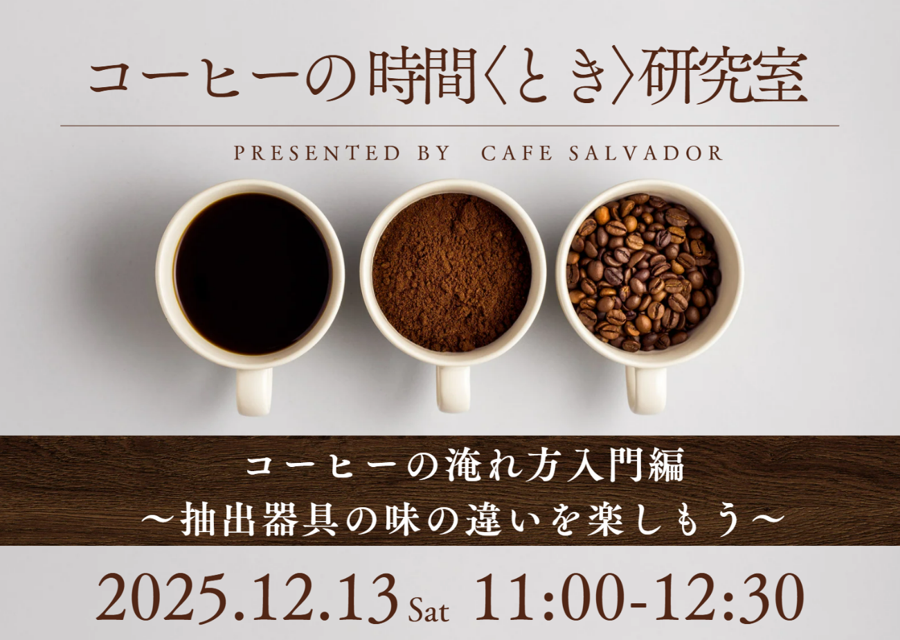 2025年12月13日土曜日。東京都中央区茅場町の「CAFE SALVADOR」で、「コーヒーの時間〈とき〉研究室 コーヒーの淹れ方入門 抽出器具の味の違いを楽しもう ~PRESENTED BY CAFE SALVADOR」と題したワークショップが開催されました。