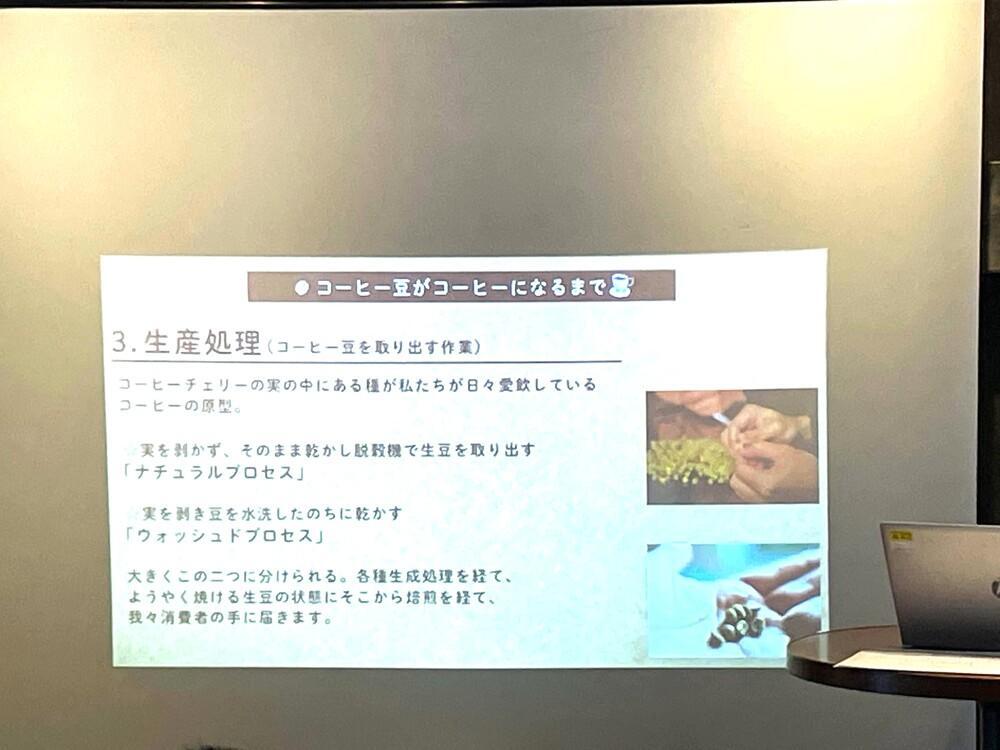 コーヒー豆ができるまでの生産処理についても紹介。よく聞くナチュラルやウォッシュドは、生産工程で豆を洗うか、洗わないかの差であることなど、わかりやすく教えてくださいました。