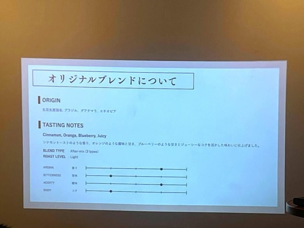 焙煎は京都の小川珈琲が担当していること。豆はブラジル、グアテマラ、エチオピアをブレンドし、誰もがおいしいと感じられる味をイメージしているなど、コーヒーへのこだわりが語られました。