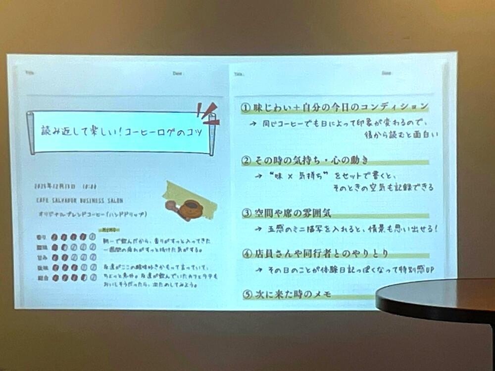 参加者の皆さんがペンやシールなどを使いながら、コーヒーログを書いている間、「CAFE SALVADOR」で提供されているコーヒーについても紹介。