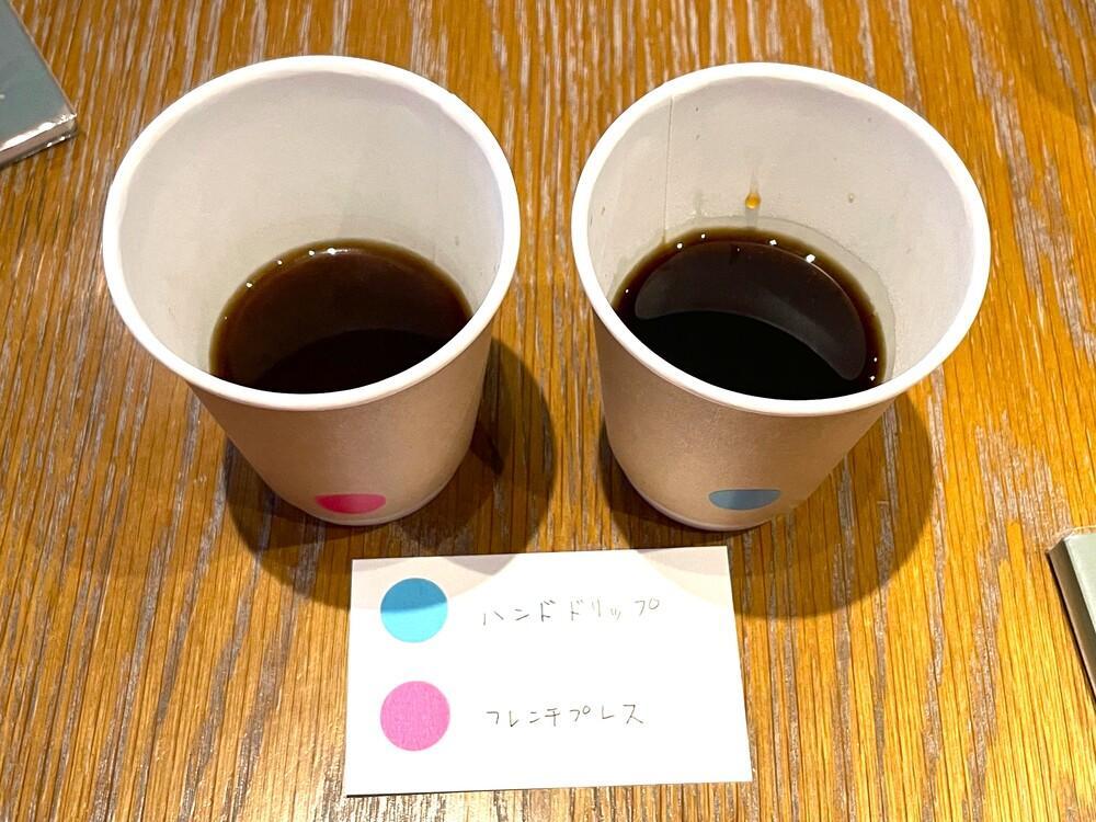 ハンドドリップの方は色からも想像できる通り、深い苦味とコクがありました。一方、フレンチプレスで淹れたコーヒーは、酸味が少し出ていて、フルーティーで華やかな味わい。