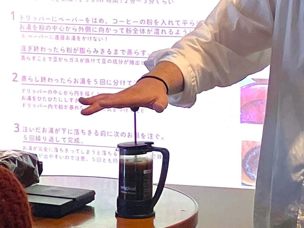 今回はハンドドリップとフレンチプレスの2種類で、おいしく淹れる方法を紹介。参加者のなかからは「動画を撮ってもいいですか」と言った声も聞こえます。