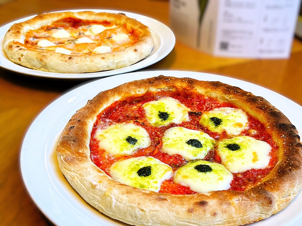 筆者がいただいたのは、マルゲリータピザと、スモークサーモンとクリームチーズのピザ。