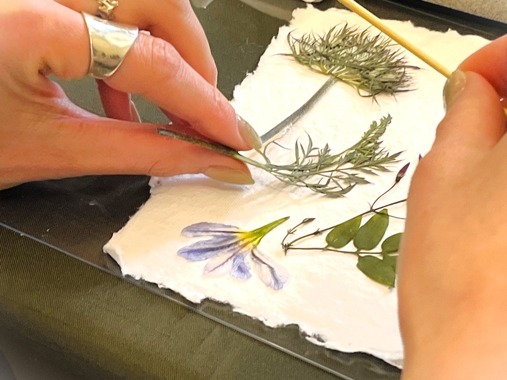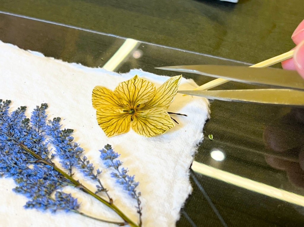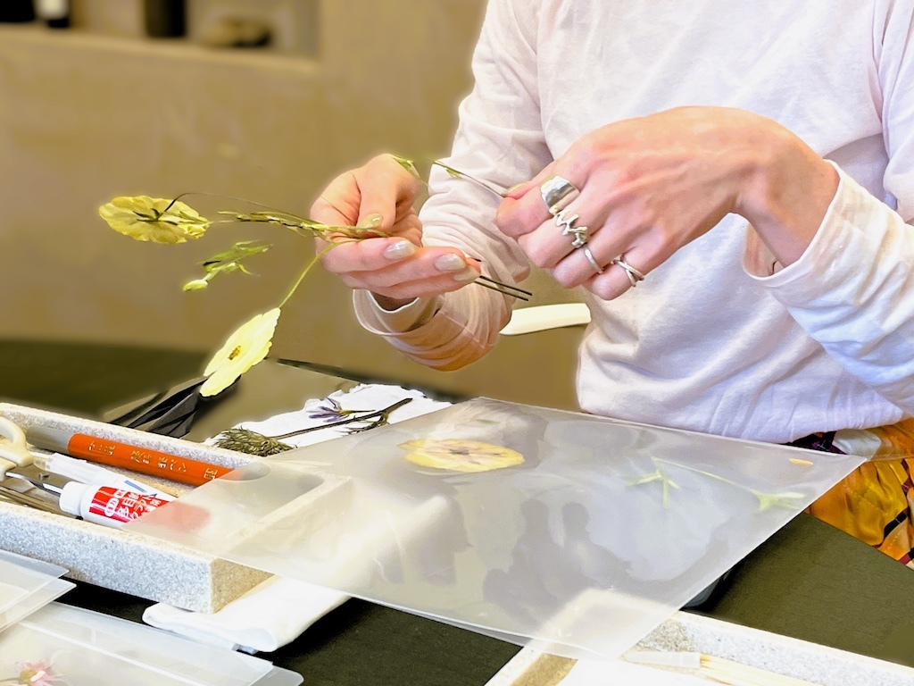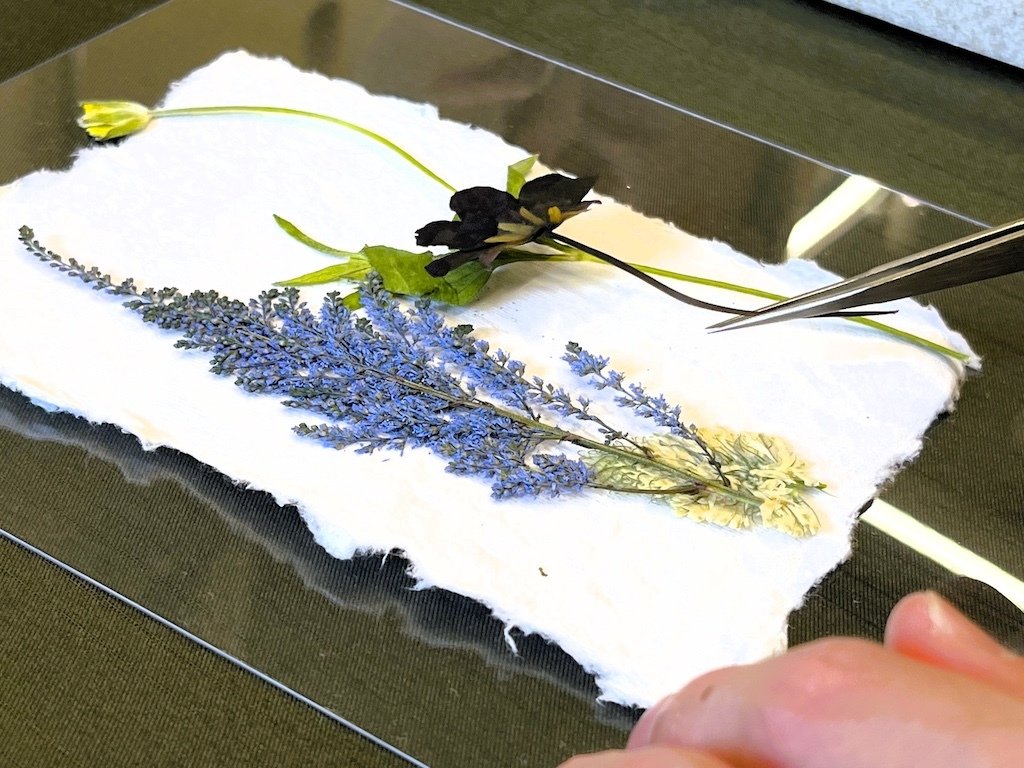 構図決めから接着まで、繊細な押し花を扱う作業は想像以上に集中力を要します。