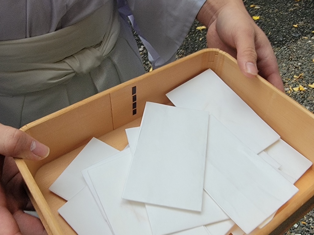 その後、「人形(ひとがた)」と呼ばれる人の形をした紙で、頭、肩、背中、足など、体全体を自分でなでるようにして払っていきます。この所作によって、知らず知らずのうちに犯してしまった罪や穢れを人形に託すとされています。