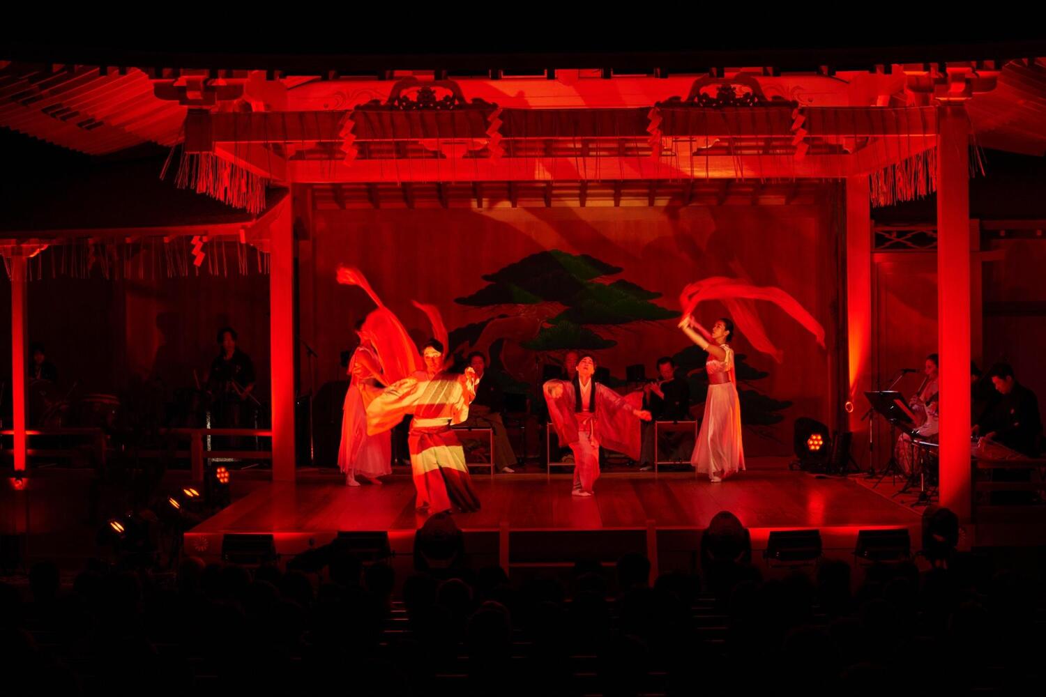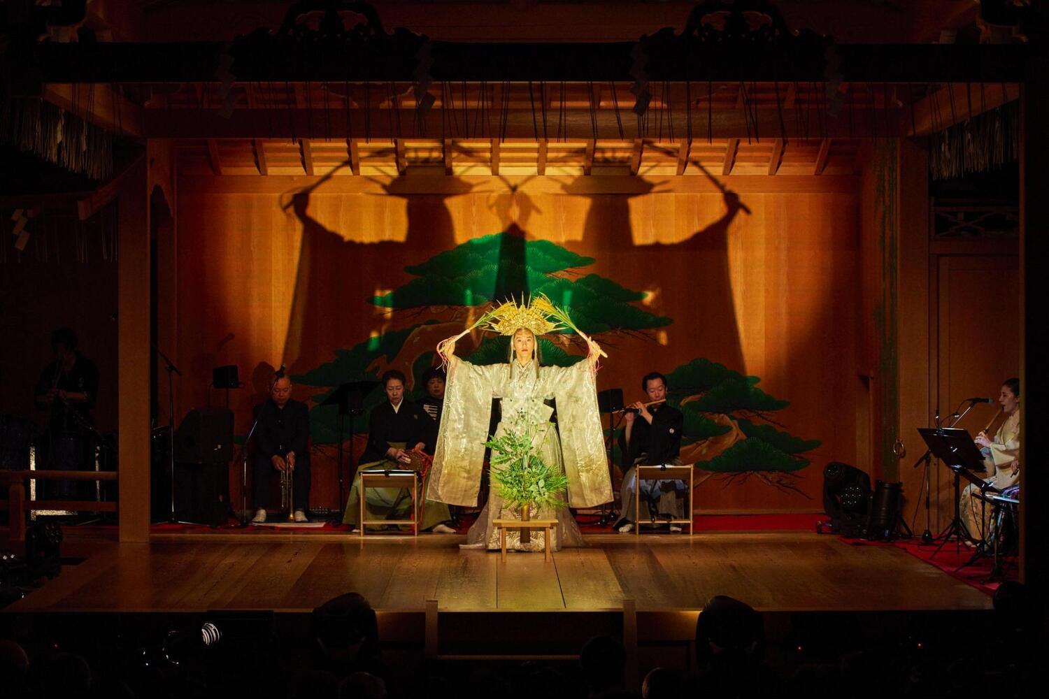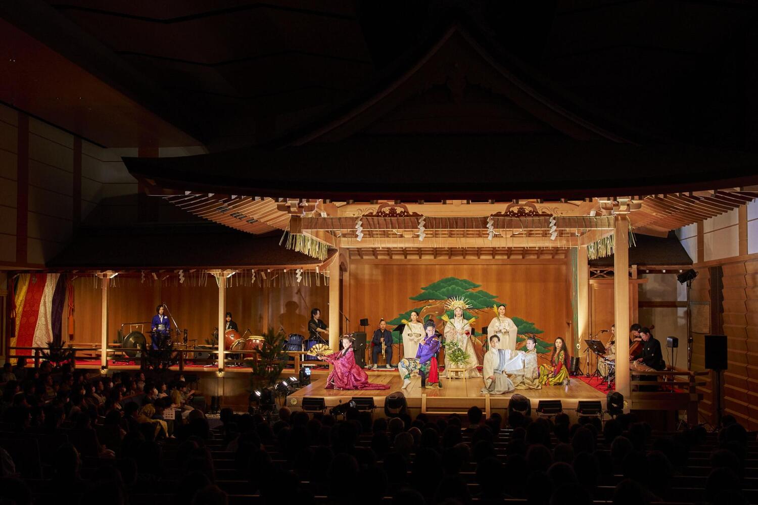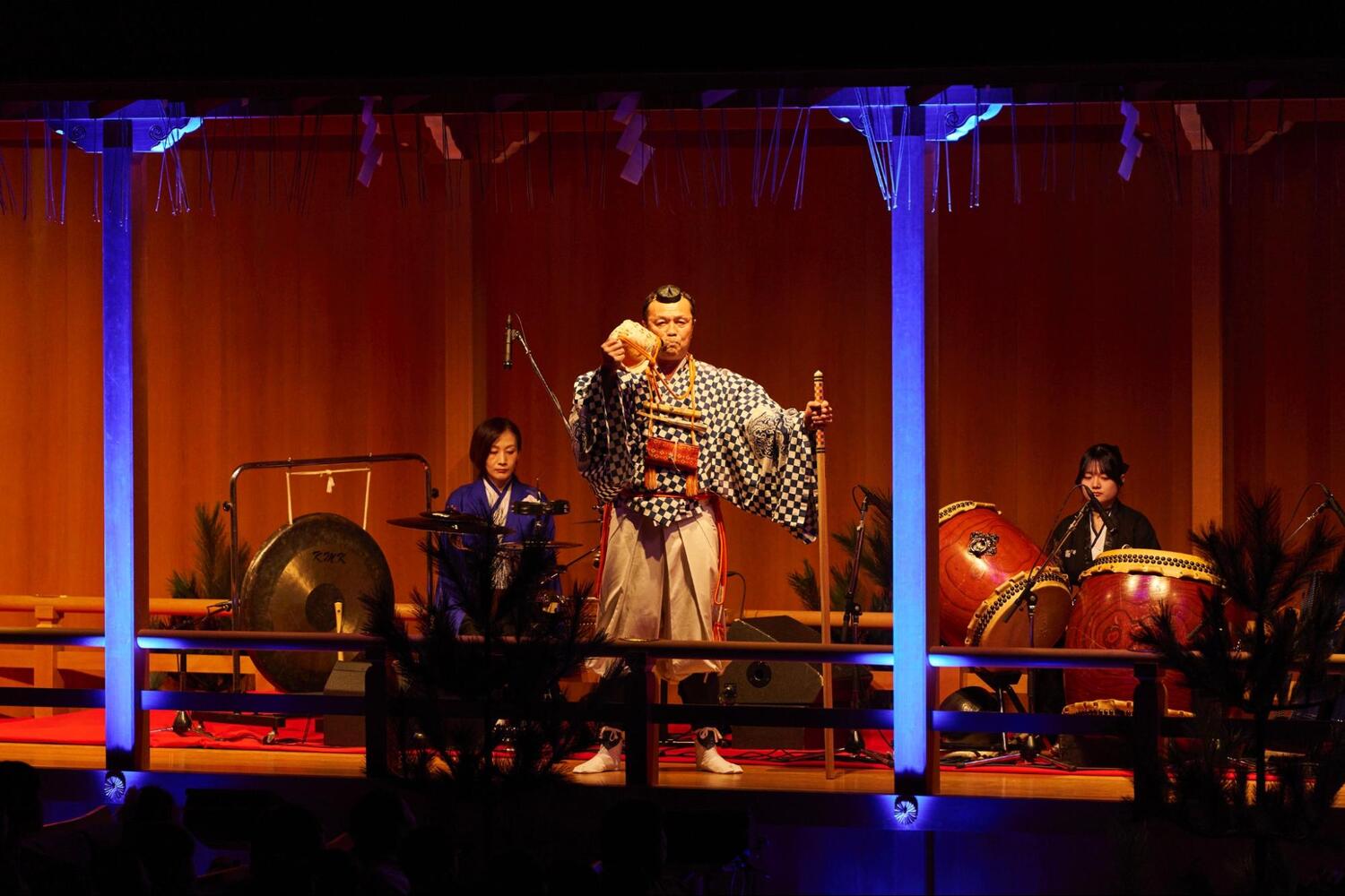 客席に座り、美しい舞台を眺めていると、日常の慌ただしさがすーっと遠ざかっていくのがわかります。そして、場の空気を浄めるように響き渡ったのは、山伏による「法螺貝」の荘厳な音色。まるで、これから始まる神話の世界への扉が開かれる合図のよう。この特別な場所が、私たちの心を非日常へと切り替える、最初の演出でした。