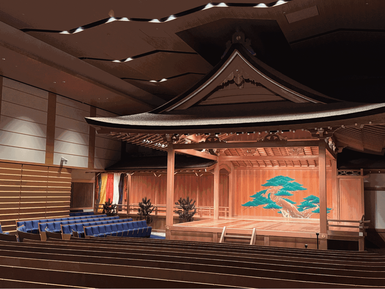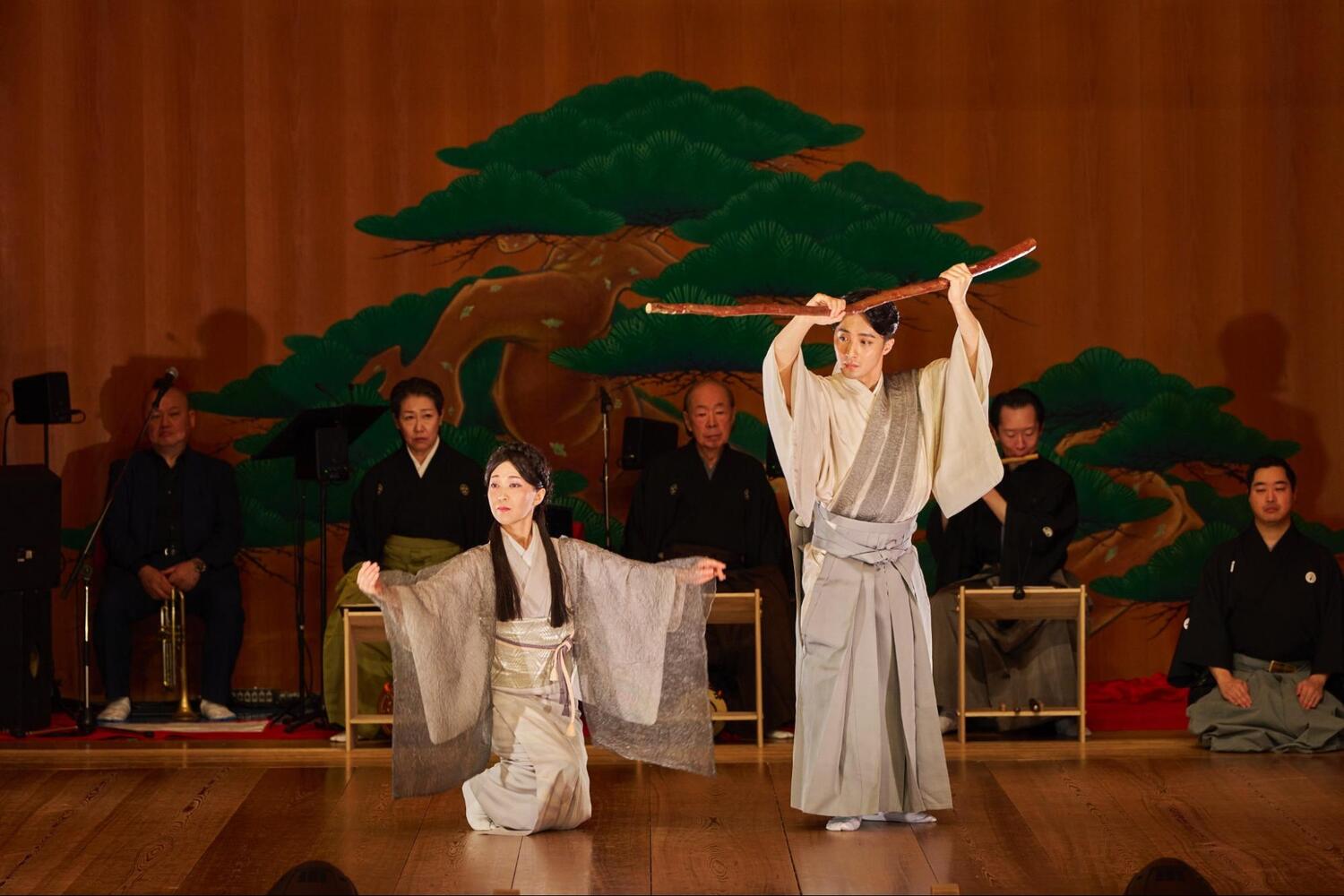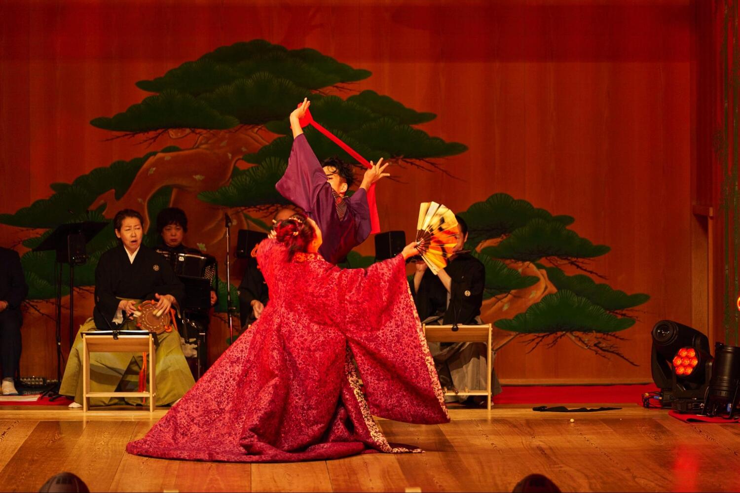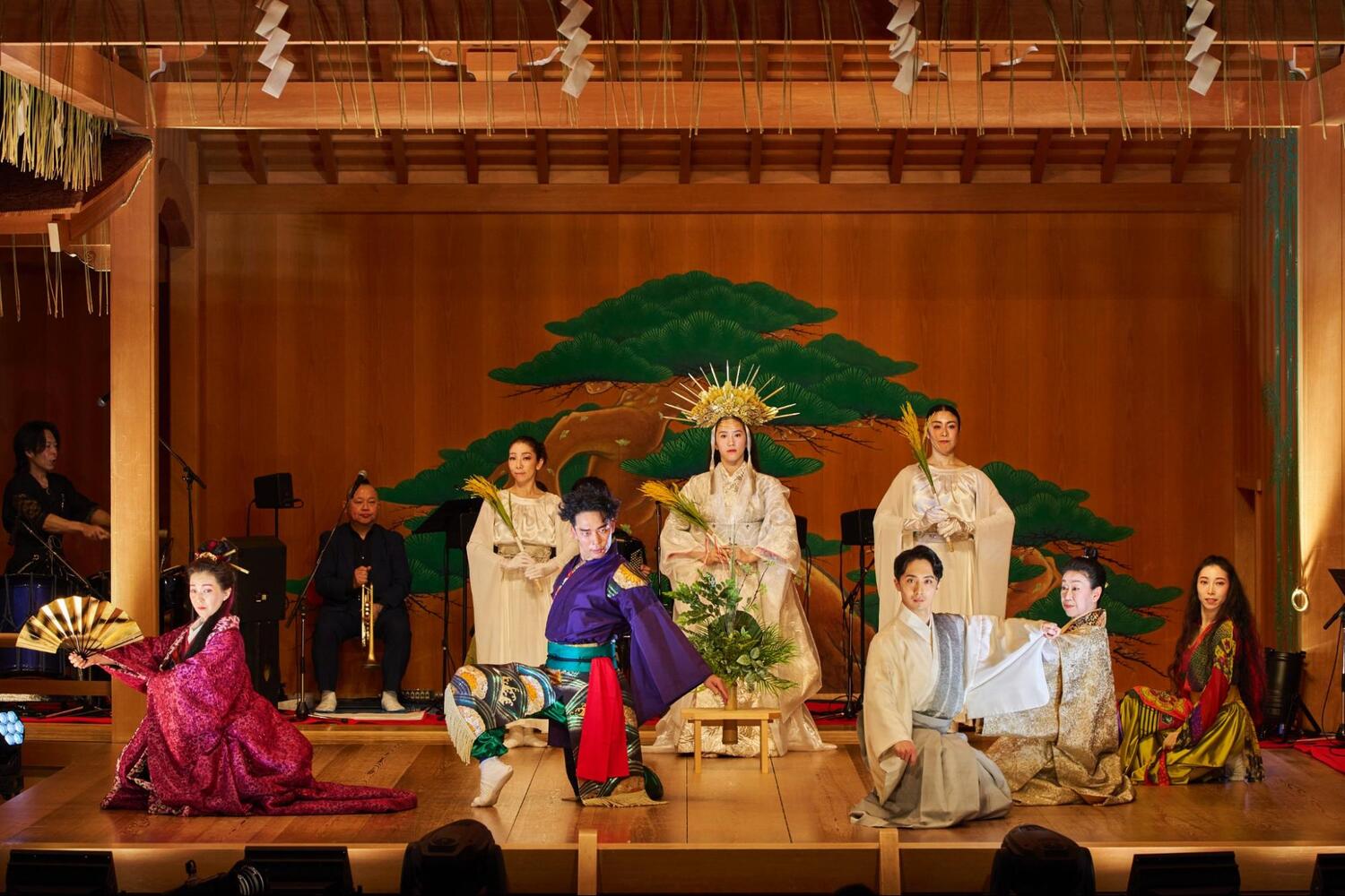 客席に座り、美しい舞台を眺めていると、日常の慌ただしさがすーっと遠ざかっていくのがわかります。そして、場の空気を浄めるように響き渡ったのは、山伏による「法螺貝」の荘厳な音色。まるで、これから始まる神話の世界への扉が開かれる合図のよう。この特別な場所が、私たちの心を非日常へと切り替える、最初の演出でした。
