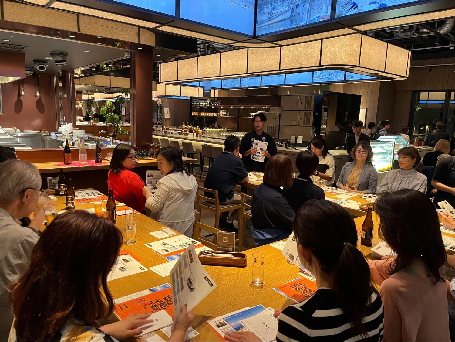 ウェルカムドリンクを飲みながら気楽に聞いてくださいとのことでしたが、皆さん真剣な様子で首藤さんに注目しています。日本酒がどのような想いで造られ、どのように土地に根付き、今後発展していくかを知ることは、これからいただく一杯をより味わい深くしてくれるでしょう。