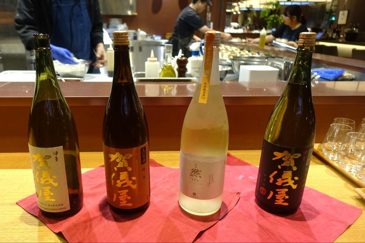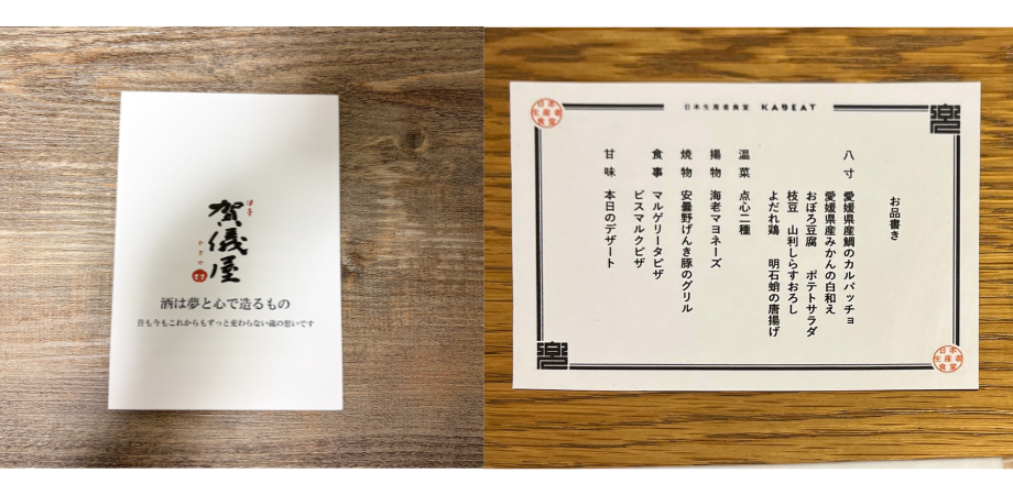 成龍酒造の日本酒への期待が高まるお話を聞き終えたところで、ここからはお楽しみの食事タイム。この日のために愛媛の食材も使った、KABEAT特製コースがテーブルを彩ります。