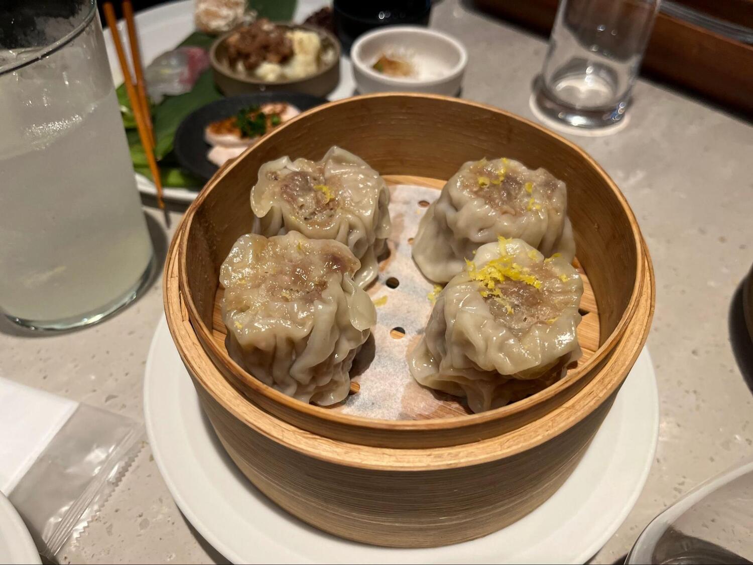八寸の次は、【温菜】点心2種が提供されます。牛タンしゅうまいとエビ蒸し餃子です。