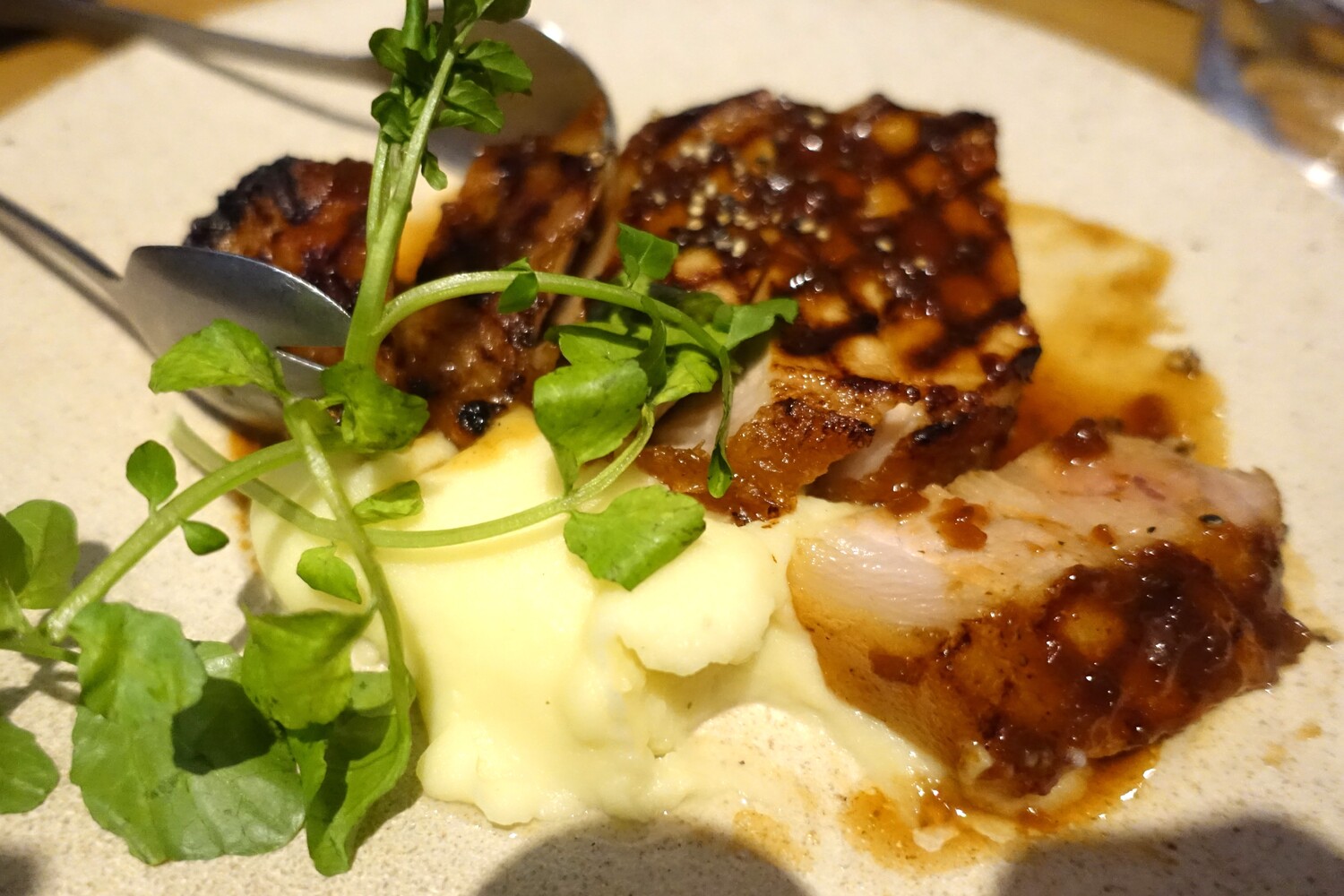 皆さん、思いがけず料理のボリュームの多さに驚いたり喜んだりの様子でした。こちらは【焼物】安曇野げんきの豚グリルです。マッシュポテトと組み合わせて食べるのも美味しかったです。