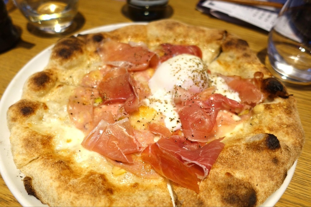 コース料理の最後となるのは【食事】マルゲリータピザ&ビスマルクピザです。どちらのピザも焼きたての熱々でテーブルに並びます。具材の美味しさもさることながら、注目したいのは生地の美味しさ。粉の風味豊かなピザ生地は、程よい香ばしさで日本酒との相性も抜群です。
