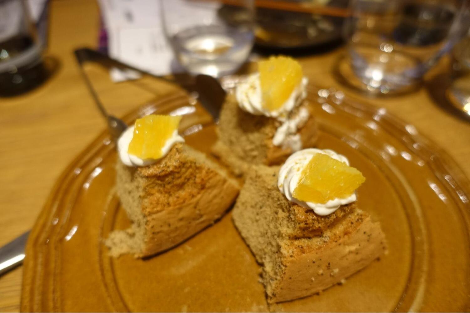 ちょうど2本目の口開けとなった冷えた「成龍然」とシフォンケーキを組み合わせると、さわやかなおいしさが口に広がります。シフォンケーキのアールグレイの柑橘の香りと「成龍然」の温和な旨味が重なり、食事やお酒を一通り楽しんだ口に、すっきりとした切り替えのタイミングを与えてくれました。